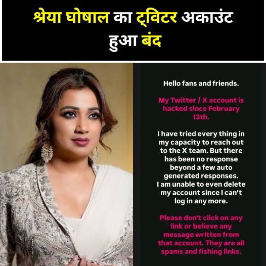श्रेया घोशाल बॉलीवुड की फेमस प्लेबैक सिंगर्स में से एक है उन्होंने अब तक के करियर में कई शानदार गाने गाए हैं वहीं अब श्रेया से जुड़ी एक बड़ी खबर सामने आ रही है दरअसल सिंगर का एक्स अकाउंट हो गया है और श्रेया ने खुद इस बात की जानकारी अपने शनिवार को श्रेया घोशाल ने अपने म तक पहुंचने के लिए अपनी क्षमता से हर संभव कोशिश की है लेकिन कुछ ऑटो जनरेटर रिस्पांस के अलावा कोई रिस्पांस नहीं आया है.